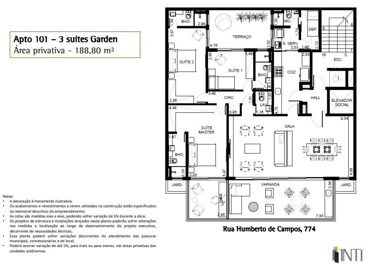 Apenas 5 unidades, sendo 1 por andar; 1 apto garden, 3 aptos tipo e 1